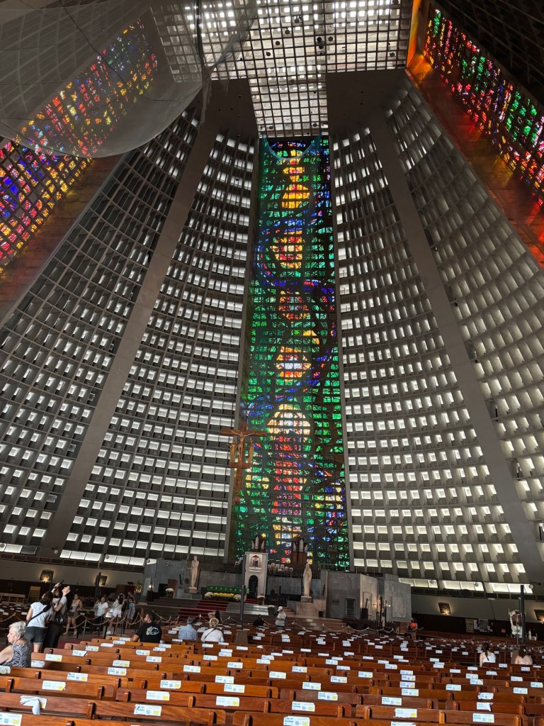 “What an unusual shape for a catholic church,” I thought as we approached The Metropolitan Cathedral of Saint Sebastian, better known simply as “The Cathedral”. Its style was based on the shape of a Mayan pyramid, and the building has a diameter of 315 feet. The inside has seating for 5,000 with a standing room capacity of 20,000.