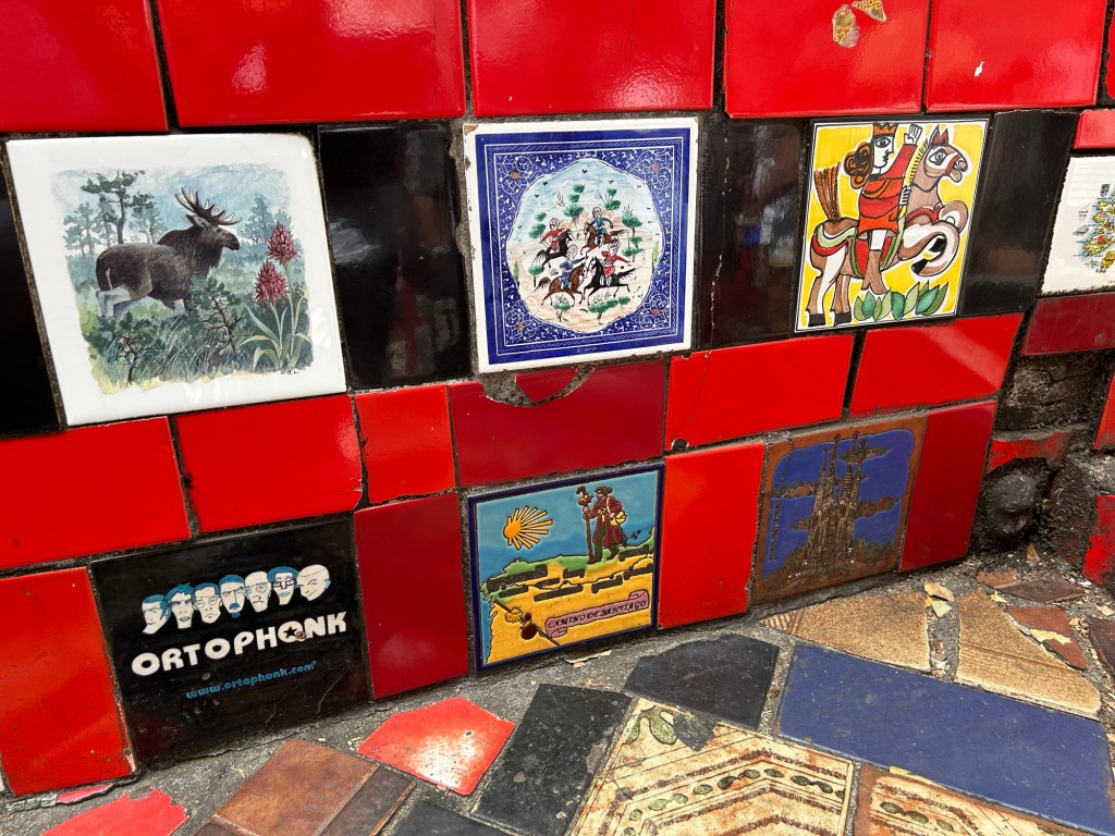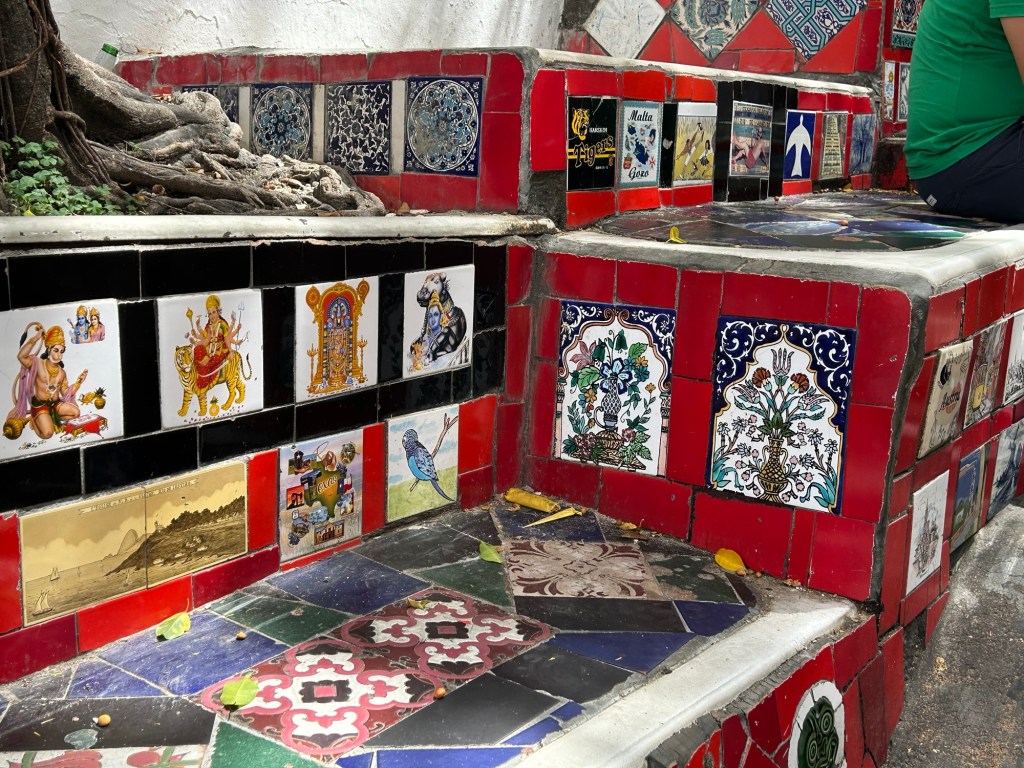 I was excited to arrive at the Selaron steps, 250 colorful, mosaic steps connecting two neighborhoods. An artist from Chile covered the steps with over 2,000 tiles from more than 60 countries of the world, beginning the project in 1990 and continuing for many years. He mainly used blue, yellow, and green colored tiles representing the flag of Brazil, and red for Chile, his home country. So many people were walking up and down them, and climbing the walls on the side that it was a challenge getting good photos.